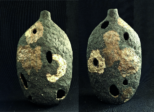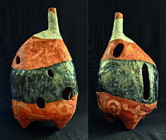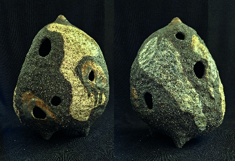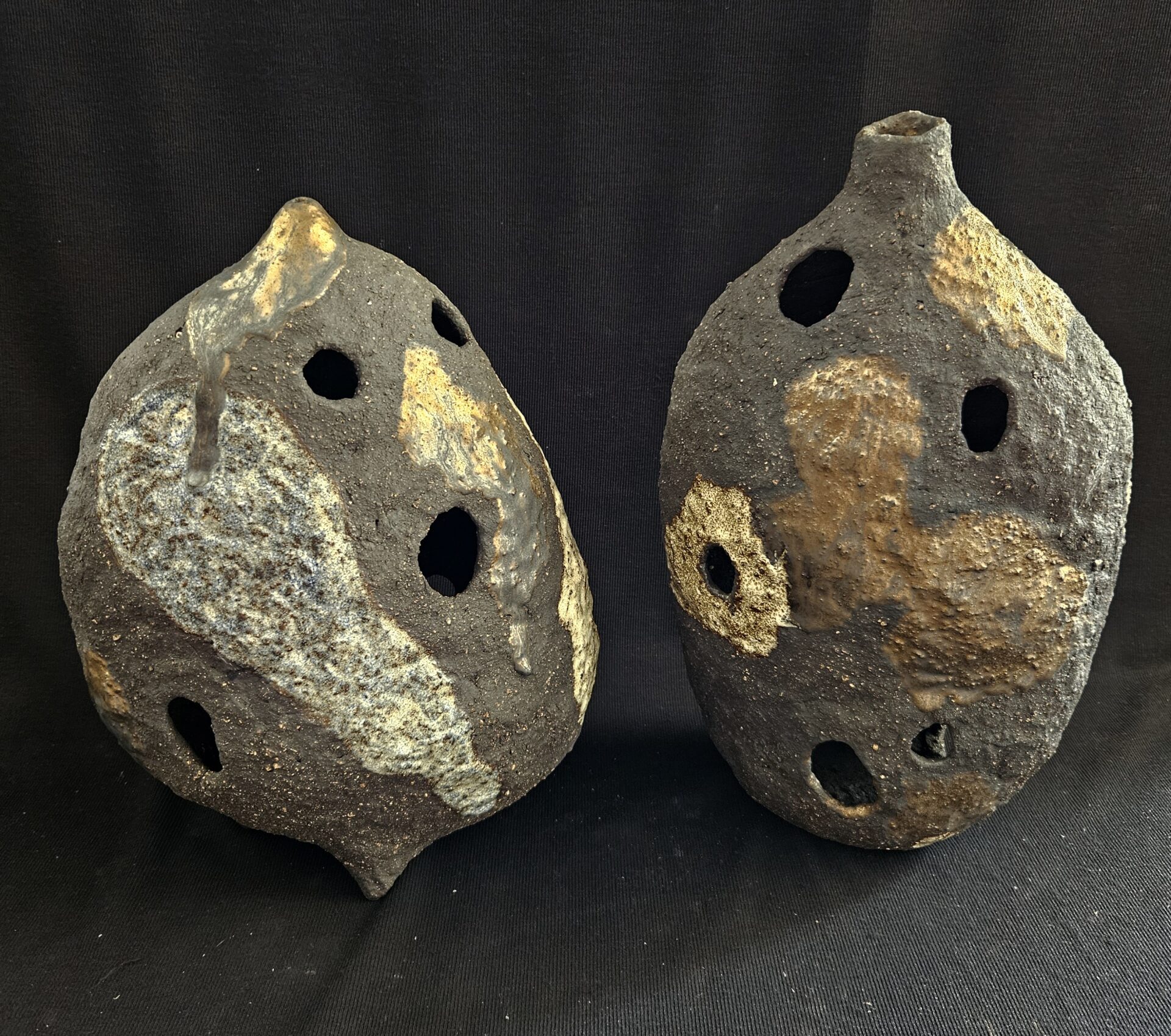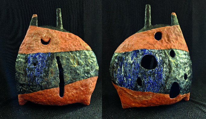 Ceramic, bronze resin, repurposed teapot lid & chain.